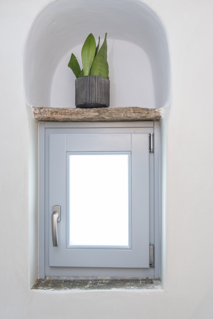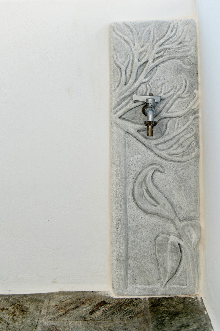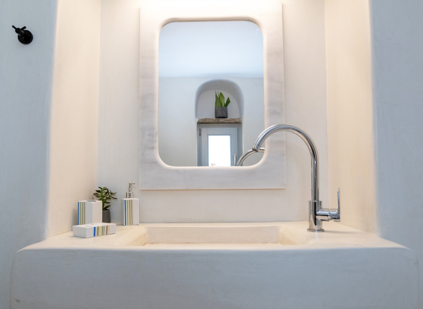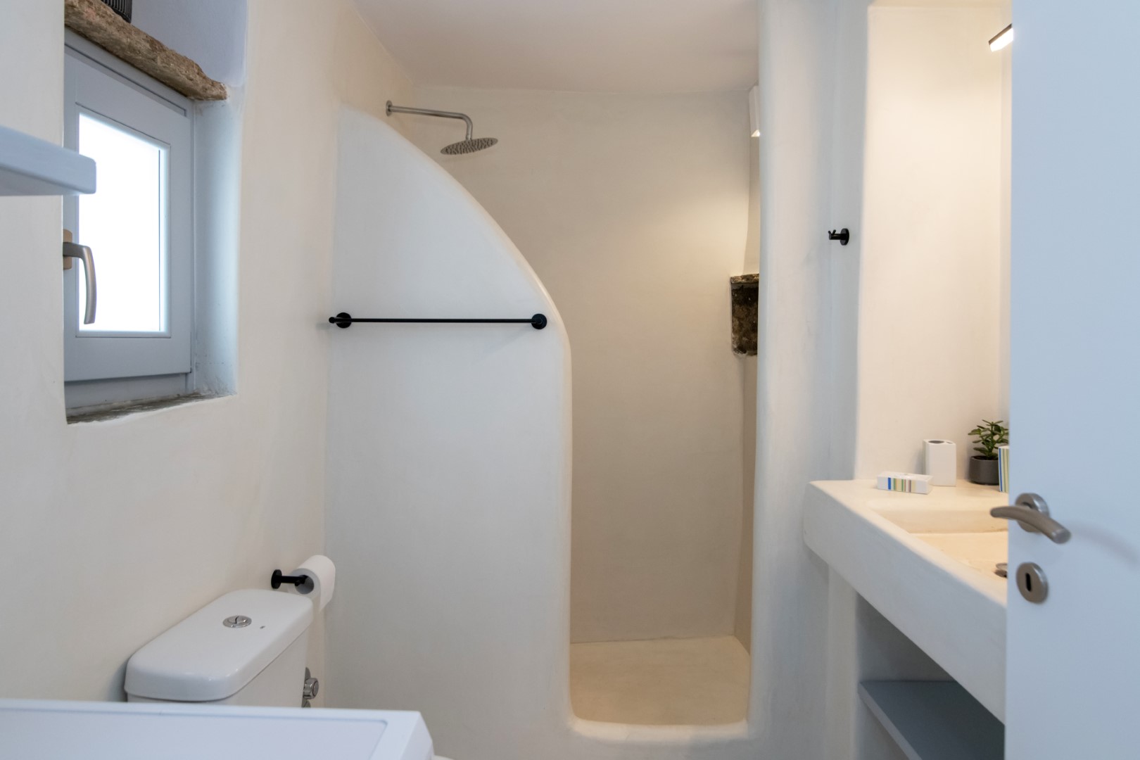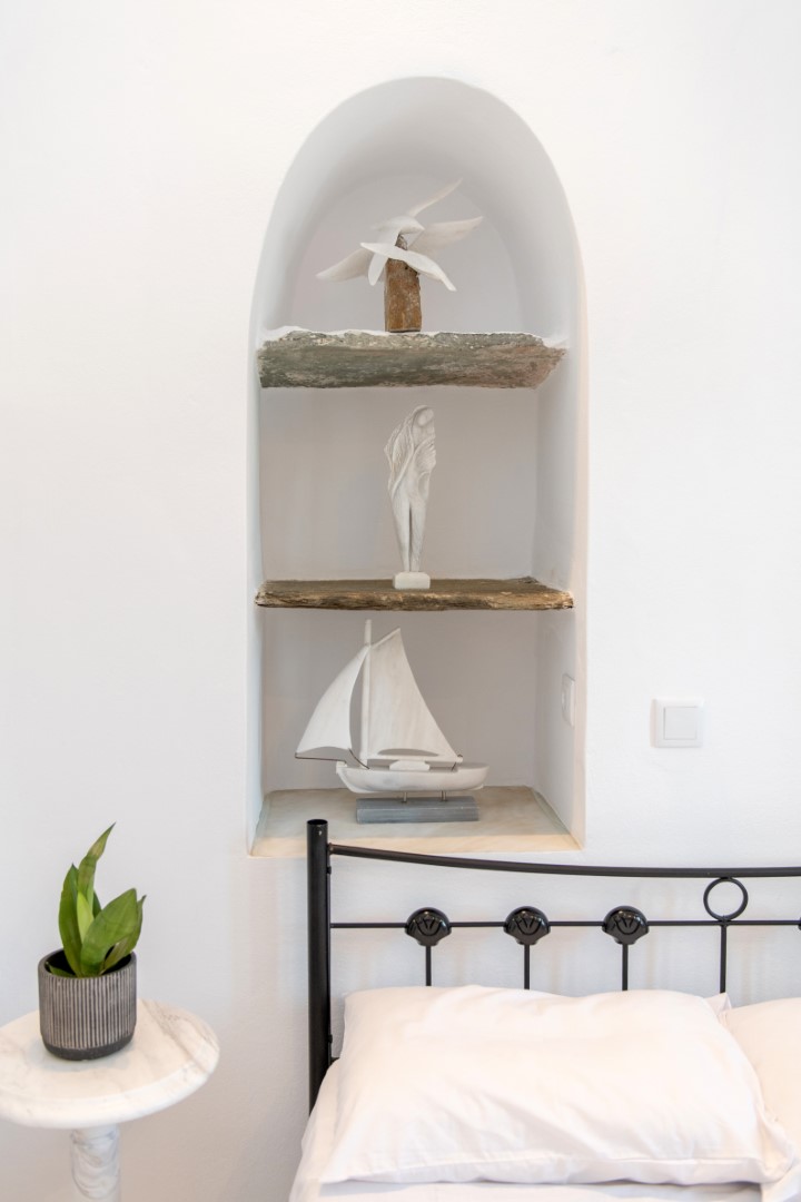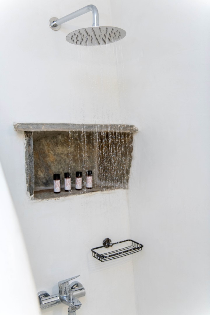 Η καλαισθησία της κατασκευής με τα λεπτά φινιρίσματα χρησιμοποιώντας νησιώτικα υλικά αντικατοπτρίζεται στα λόγια του Ιταλού σχεδιαστή που επέβλεψε την ανακαίνιση του καταλύματός μας. Αναφερόμενος, ενδεικτικά , στα σχήματα που επιλέχθηκαν για τον τοίχο του ντους: «Με αυτό το κυματιστό σχέδιο θέλαμε να θυμόμαστε οπτικά τα κύματα του Αιγαίου, ένα σχέδιο που συνοδεύεται από τον ήχο του νερού και το οποίο κάνει αυτό το Σώμα να διατηρεί έναν ισχυρό δεσμό με την περιοχή στην οποία έχει εισαχθεί ».